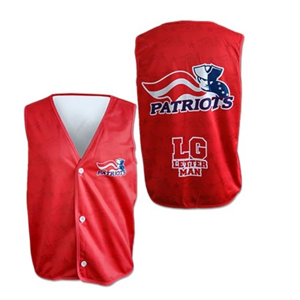 This custom polyester vest offers a comfortable fit with a soft interior, standard button-up design, and vibrant sublimation, making it perfect for gym sessions, beach trips, or branding.