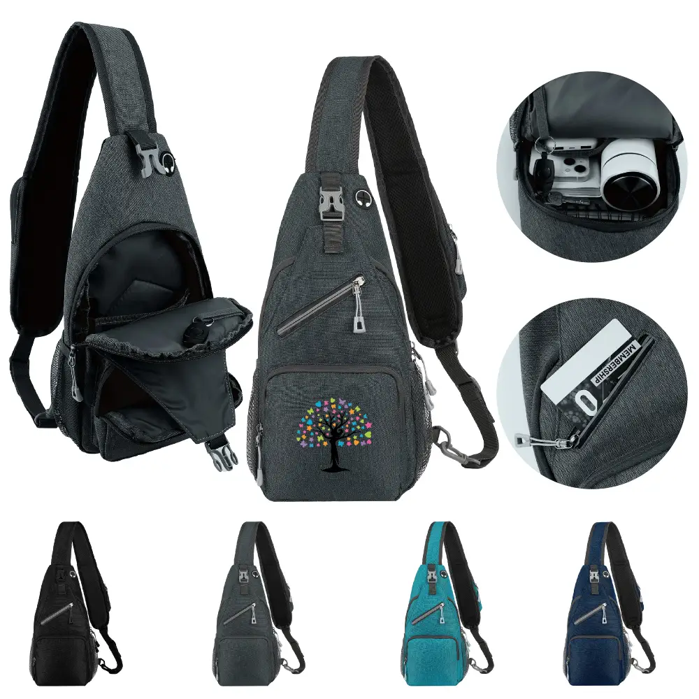 The Customized Multipurpose Chest Bag Sling Backpack is made of waterproof 300D polyester, featuring multiple compartments, adjustable straps, and breathable padding for comfort. Ideal for daily use.