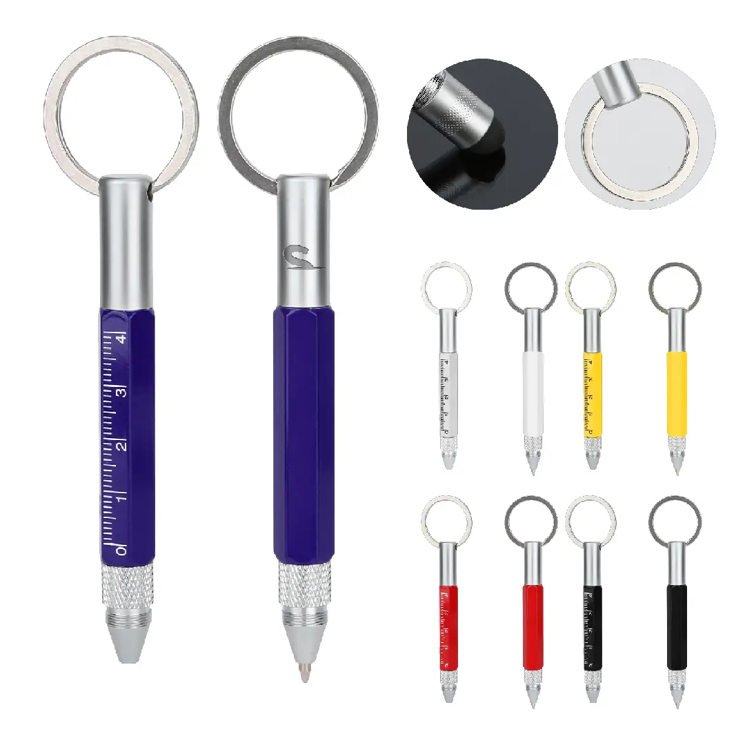 - 6-in-1 multifunction tool including a pen, ruler, level, flathead screwdriver, stylus, and keychain.