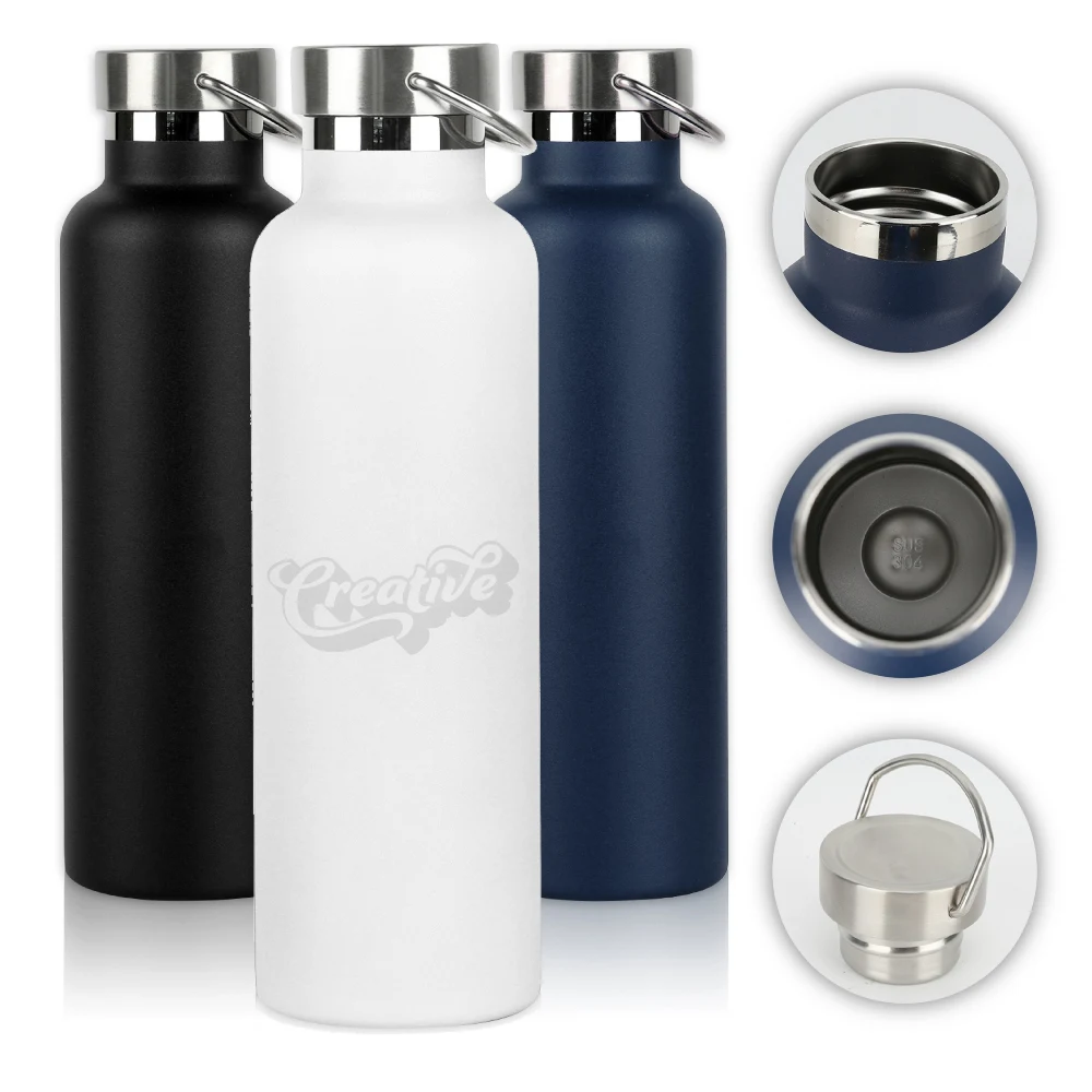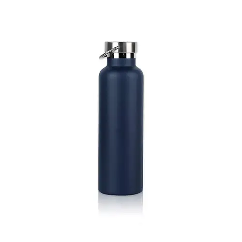 This 25 ounce vacuum sealed water bottle comes in a variety of colors to customize with your logo with one or two locations as needed. Made of durable stainless steel, this handy bottle features double wall vacuum sealed insulation to keep beverages hot or cold longer. What a great way to keep your brand in hands all year long with this 9.5" x 2.95" diameter colorful bottle with metal lid and handle. Complies with CPSIA, FDA & Prop 65.